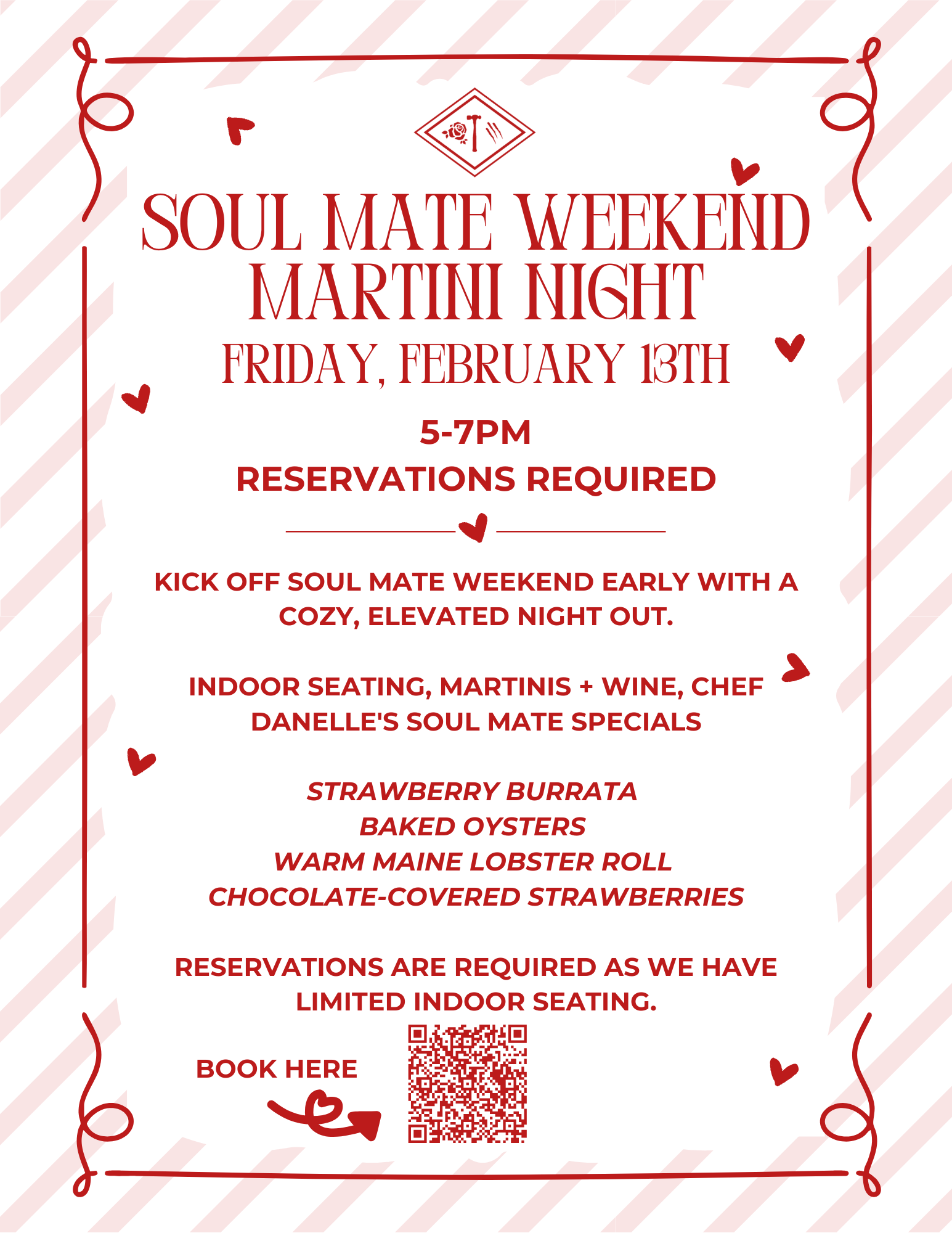 Indoor seating, Martinis + wine by the glass or bottle, & Chef Danelle's Soul Mate specials: