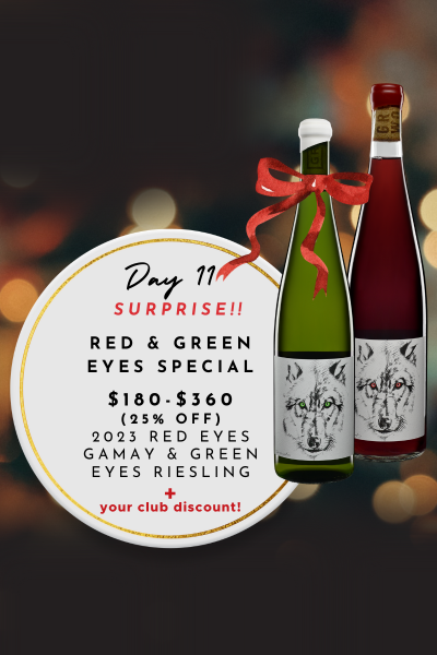 We had so many calls for this special that we decided to bring it back for one day! Members can stack their discount also! This will make the best Christmas gift or accompaniment to your holiday meal. The Red Eyes Gamay is a nod to the wines of Beaujolais, France and the Green Eyes pays homage to the white wines of the Mosel Valley in Germany.